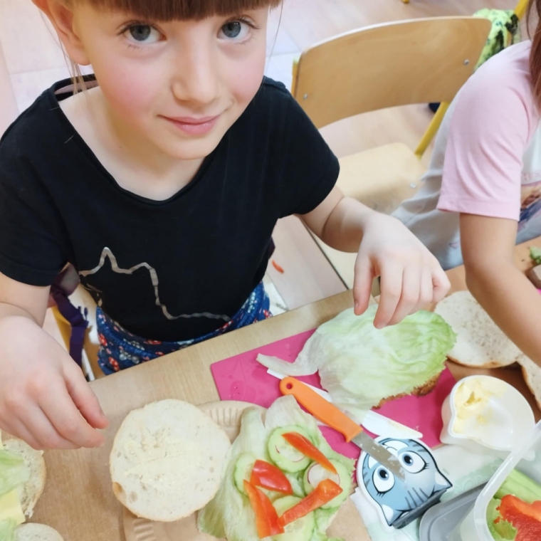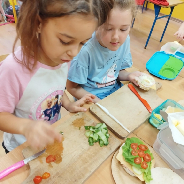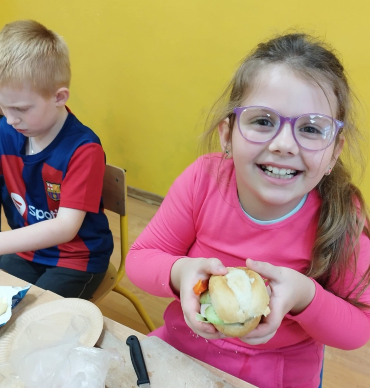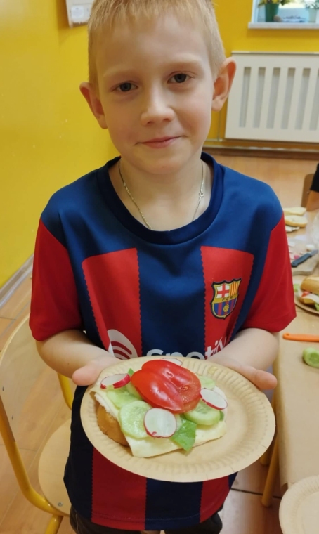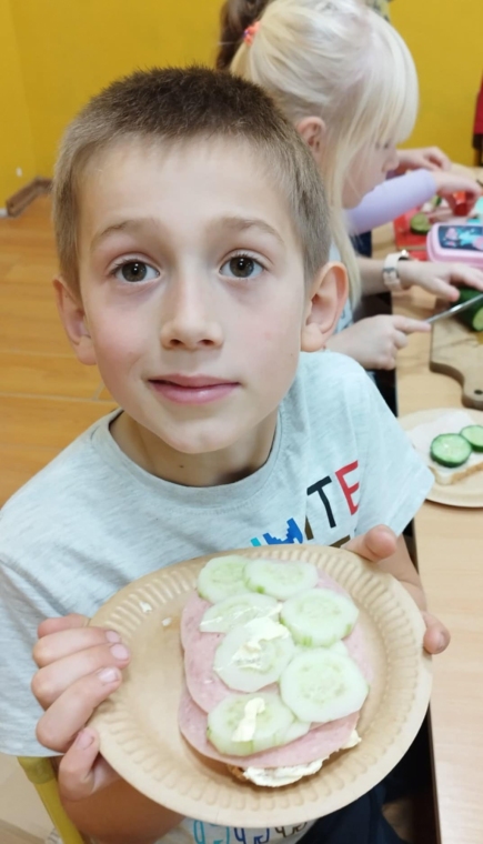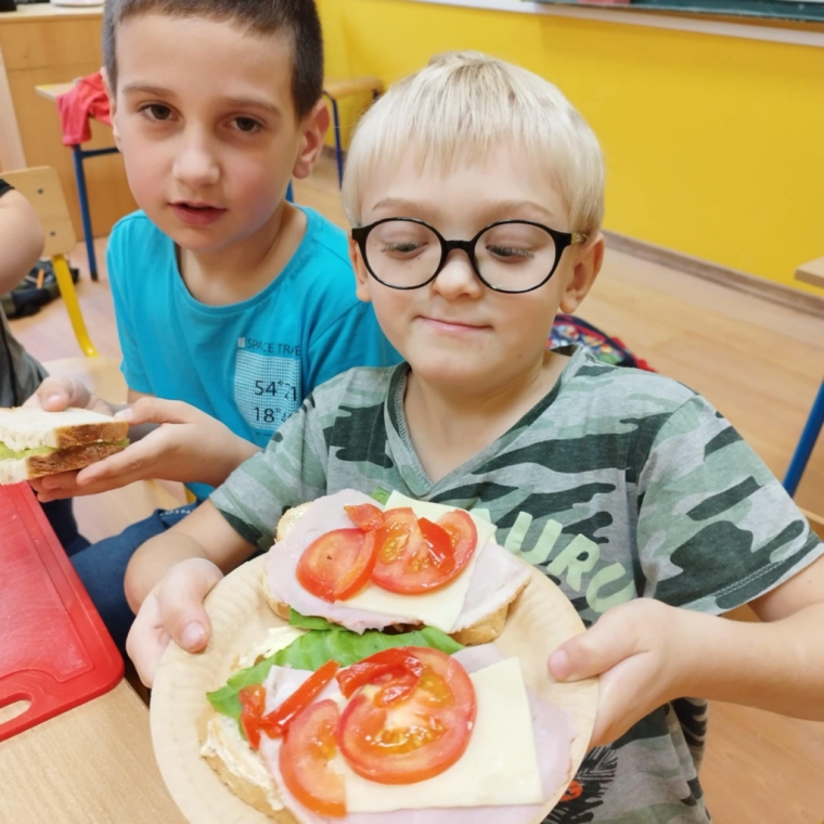 Dzisiaj klasa 1 sama przygotowała sobie drugie śniadanie. Były to zdrowe, kolorowe kanapki. Wszystkie dzieci z zaangażowaniem dobierały składniki, aby każda kanapka wyglądała wyjątkowo. Na stole nie zabrakło sałaty, pomidorów, ogórków, papryki i innych składników. Kanapki nie tylko były smaczne, zdrowe ale i pięknie ozdobione. Pamiętać należy, że najlepiej smakują potrawy wykonane samodzielnie. I to sprawdziło się doskonale. ????????????????????
