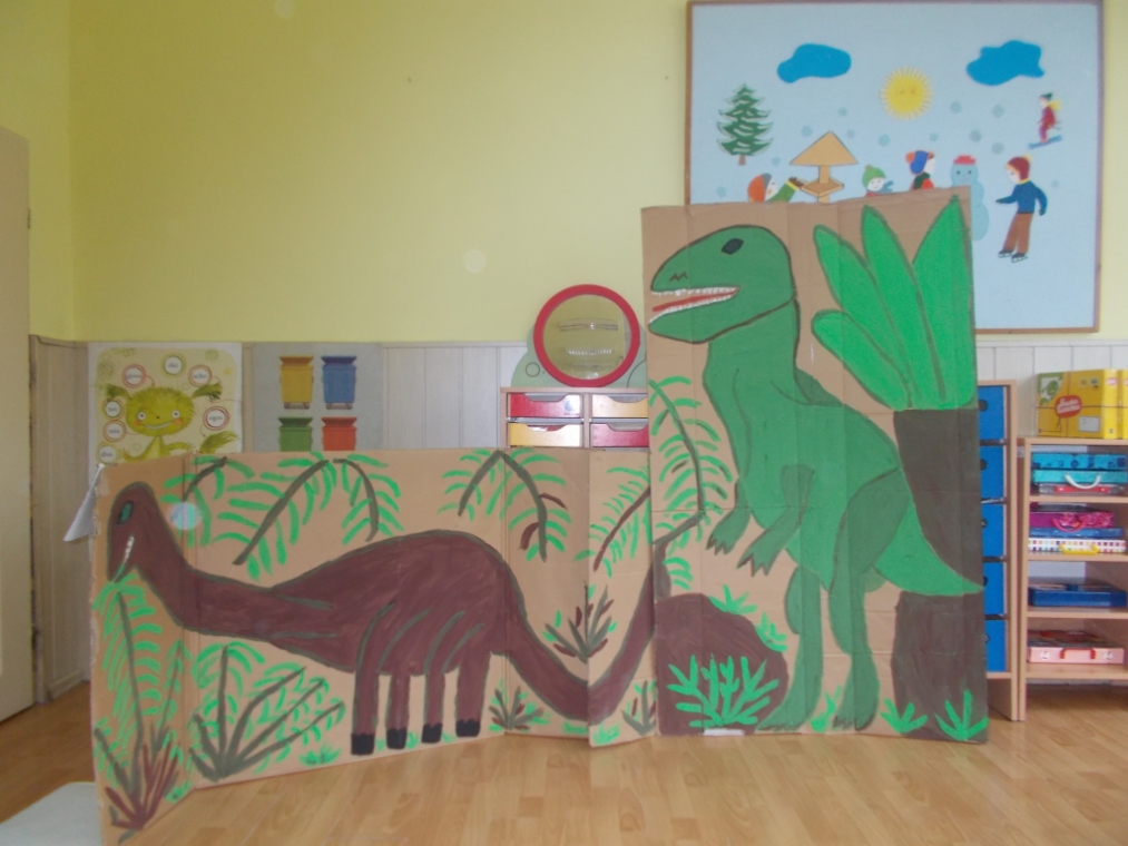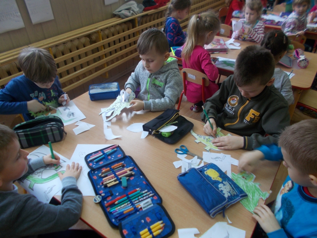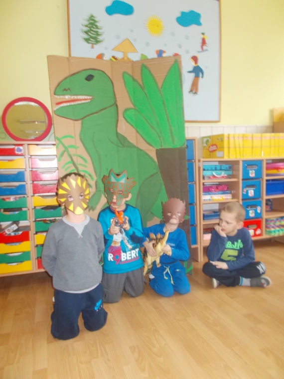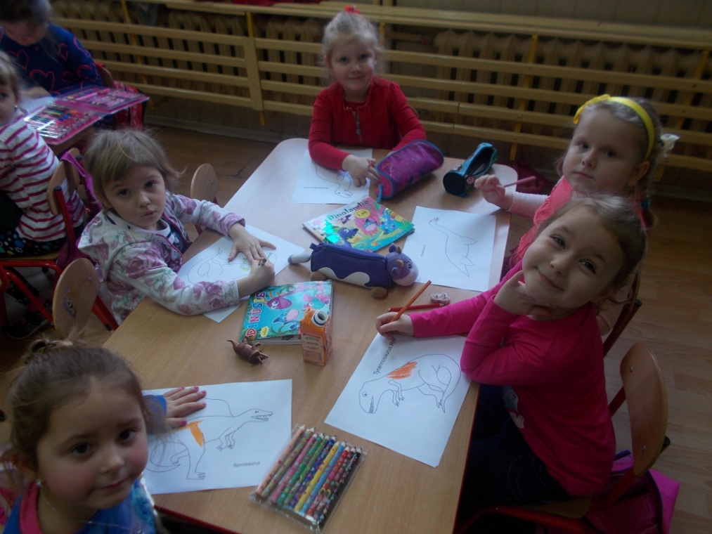 Dzieci wykonały duże plakaty przedstawiające dinozaury. Zrobiły też dla sibie maski. gdy je założyły trudno je było rozpoznać. Ponadto układały puzzle, rozwiązywały zagadki, słuchały wierszyków. Śpiewały piosenki naśladujące taniec dinozaurów.