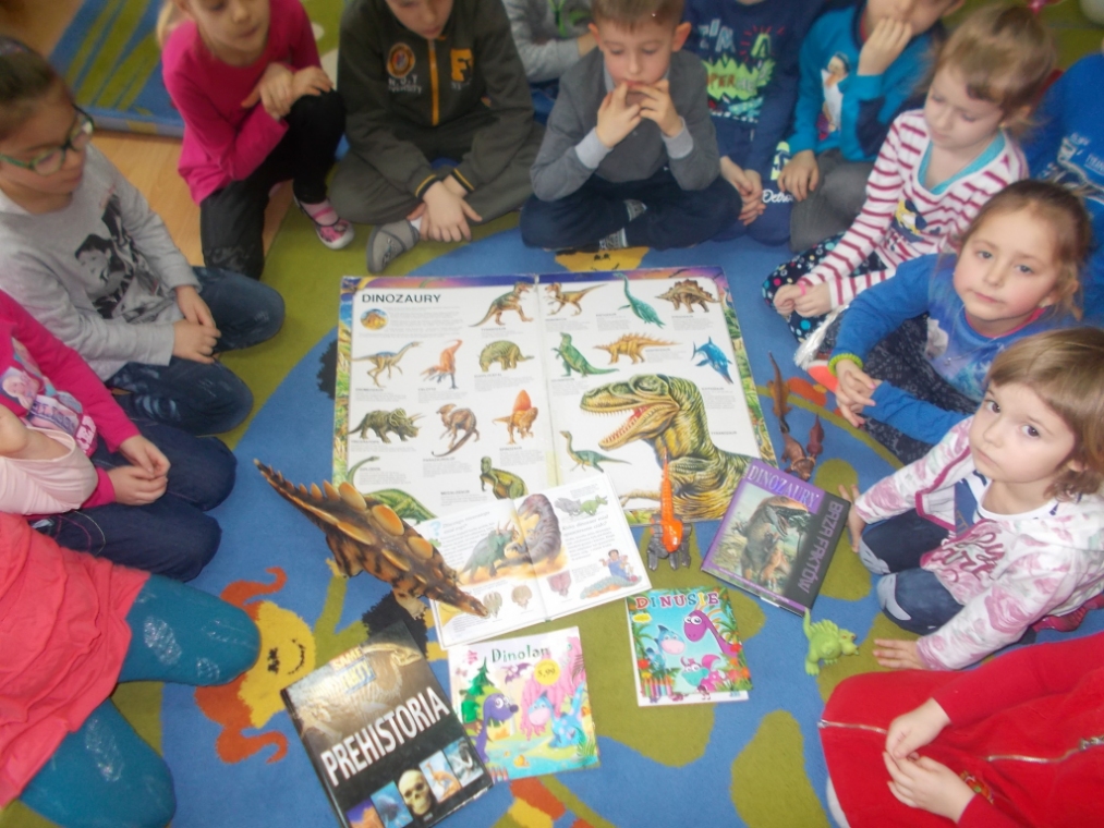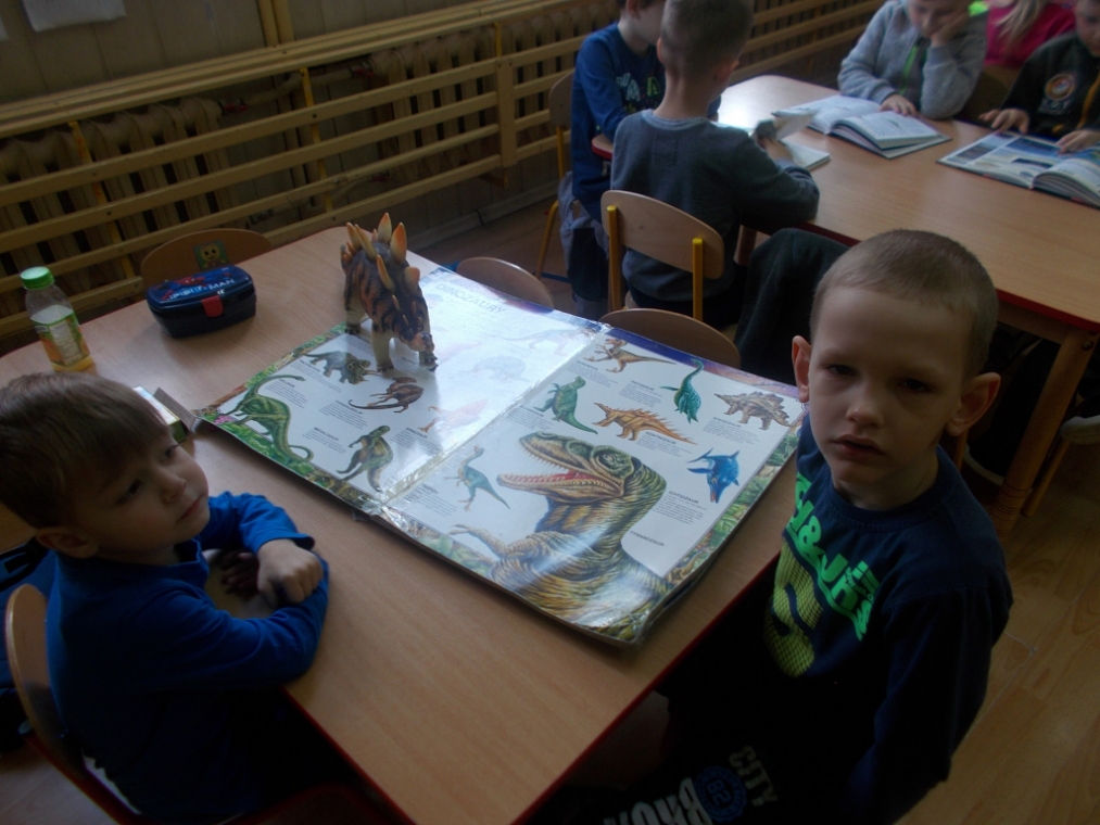 Dzieci przyniosły w tym dniu swoje zabawkowe dinozaury. Wzajemnie dzialiły się przyniesionymi skarbami i opowiadały o nich. Panie zgromadziły też albumy, książki o dinozaurach, wszystko po to aby stworzyć piękną kolekcję stworzeń, które setki milionów lat temu zamieszkiwały ziemię.