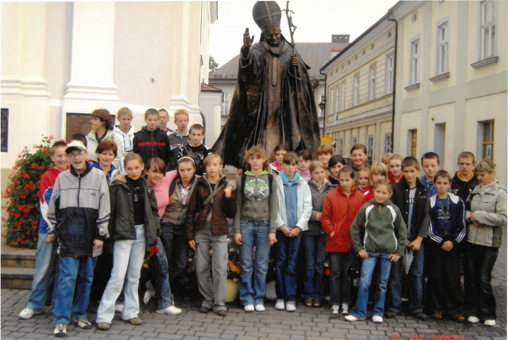 10 października 1993 roku nadano naszej szkole imię Ojca Świętego Jana Pawła II. Od tej pory uczestniczymy w różnego rodzaju uroczystościach i spotkaniach, które pogłębiają naszą więź z Patronem. Przeżyliśmy niezapomniane chwile na pielgrzymkach, w czasie których mogliśmy razem z Janem Pawłem II uczestniczyć w Eucharystii, modlić się i śpiewać . Byliśmy w Skoczowie, Krośnie, Starym Sączu, Krakowie i nigdy nie zapomnimy wzruszających chwil, których tam doświadczyliśmy. Kiedy Ojciec Święty zmarł, poczuliśmy ogromną pustkę i żal. Jednak cały czas staramy się wcielać w życie Jego nauczanie. W każdym roku organizujemy Gminny Przegląd Słowno- Muzyczny pod hasłem "Odszedłeś, lecz jesteś", wyjeżdżamy na Ogólnopolskie Spotkania Rodziny Szkół im. Jana Pawła II do Częstochowy, bierzemy udział w różnych konkursach poświeconych Papieżowi. Każdą ważniejszą uroczystość w naszej szkole rozpoczynamy hymnem , którego słowa napisała jedna z uczennic. Widok śpiewjącej młodzieży napawa nas optymizmem. Wierzymy, że nigdy nie zapomną o swoim Patronie i wielkim Polaku:
