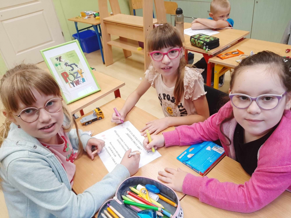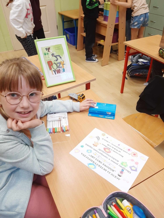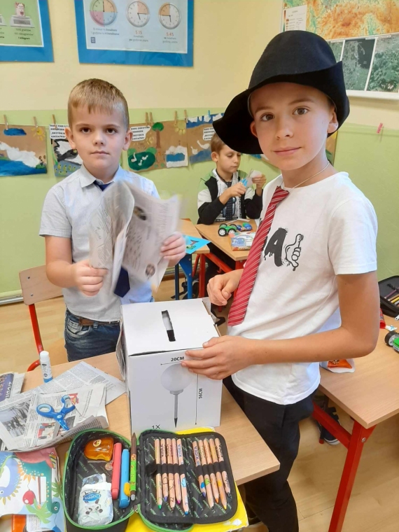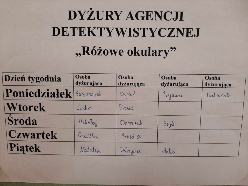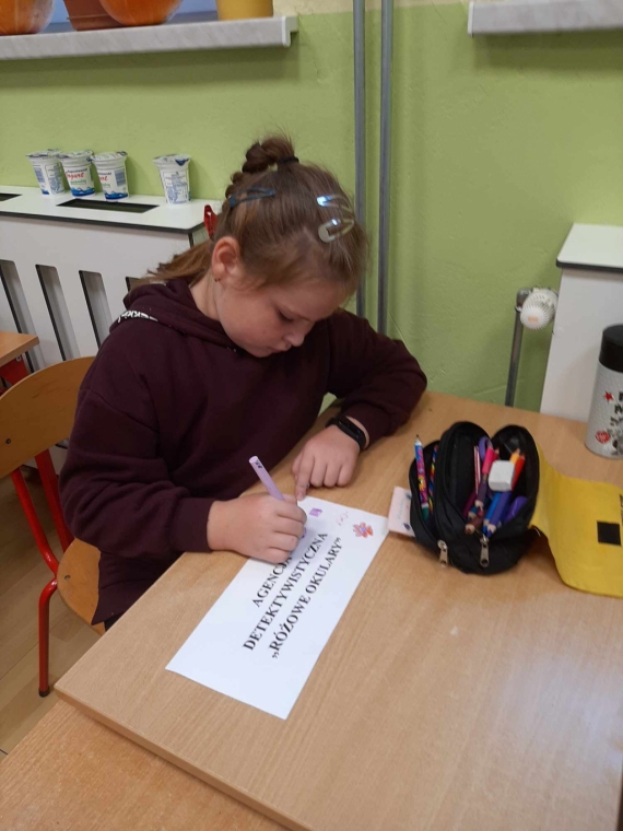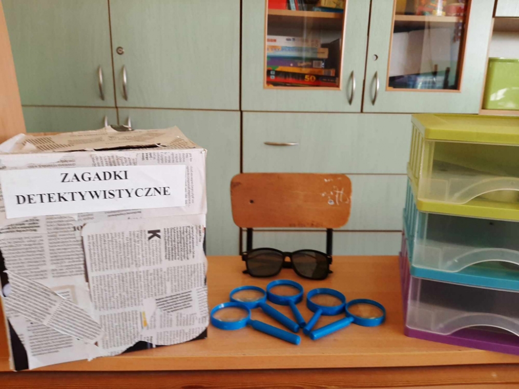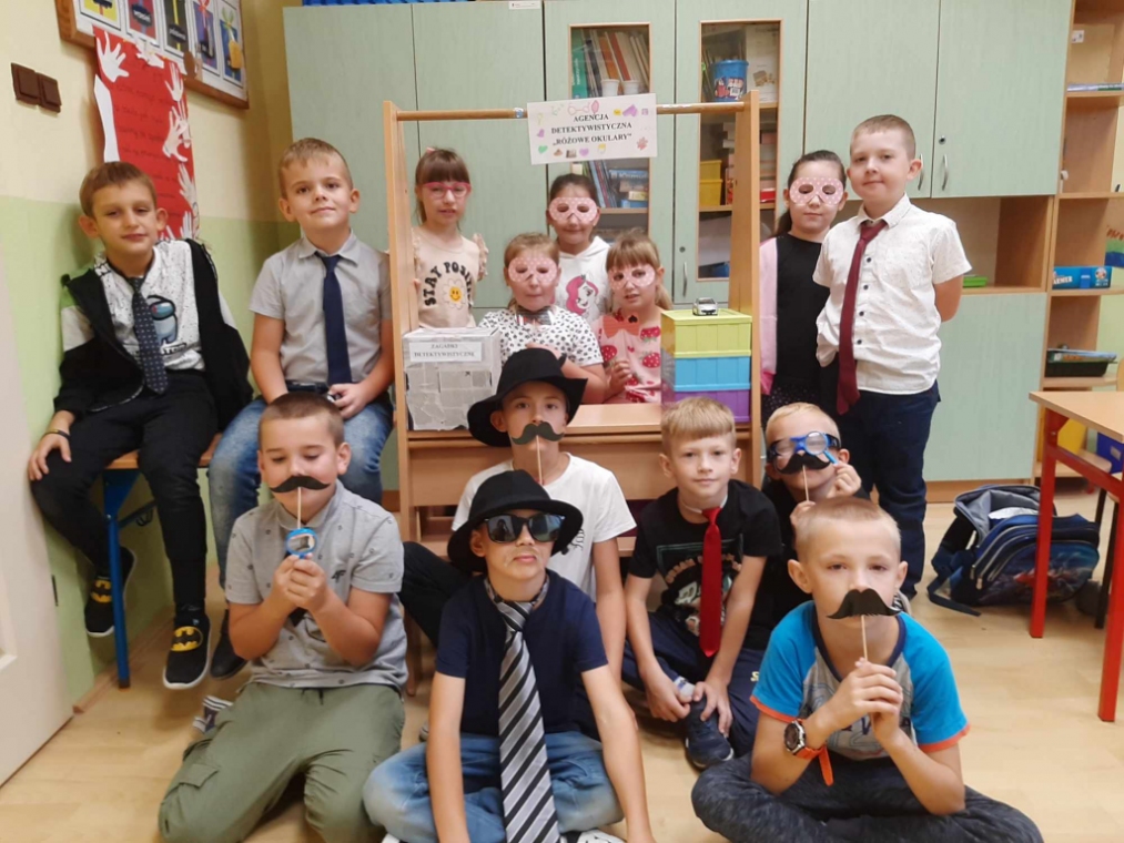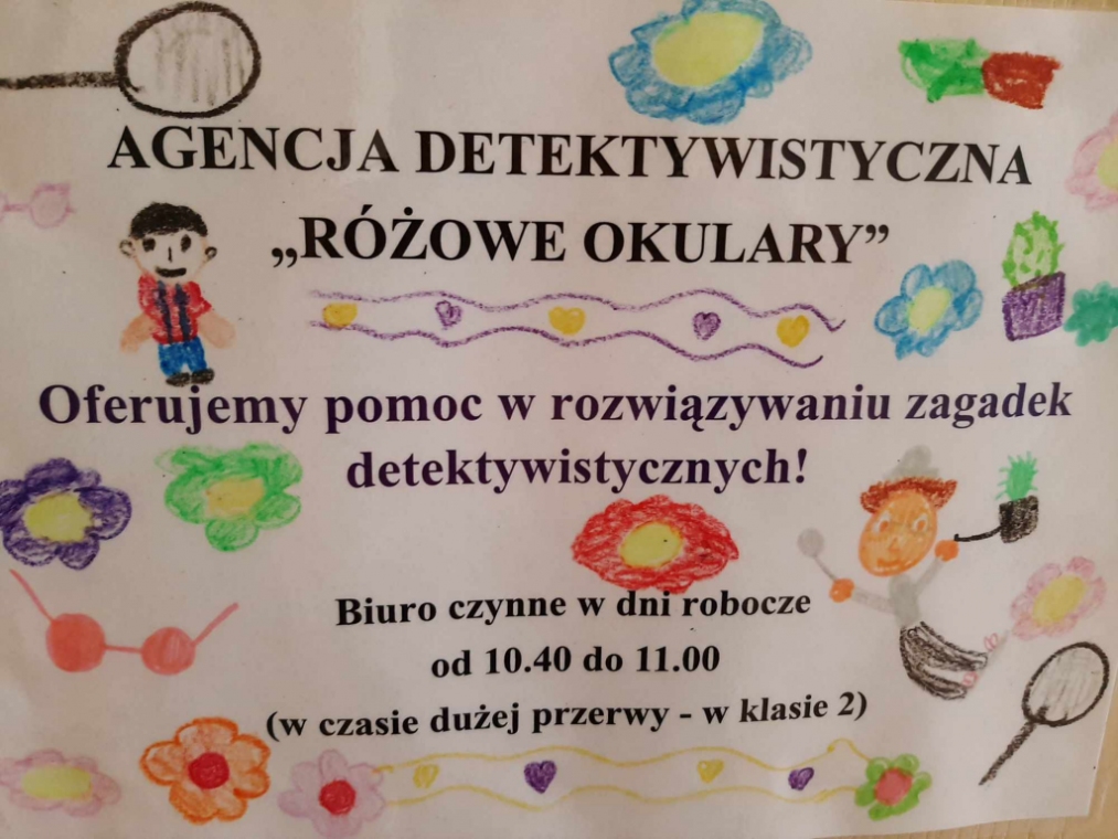Uczniowie klasy drugiej - zainspirowani lekturą Grzegorza Kasdepke pt. „Detektyw Pozytywka”- założyli w swojej sali agencję detektywistyczną. Podczas realizacji tego projektu dzieci zaaranżowały biuro agencji, zgromadziły potrzebne rekwizyty, wykonały szyld informacyjny, pudełko na zagadki, plakat reklamujący działalność oraz wizytówki. Świetnym doświadczeniem dla małych detektywów było rozdawanie wizytówek i reklamowanie agencji na terenie szkoły – sprawiło im to dużo frajdy. Wszystkie dzieci pragnęły pracować nad rozwiązywaniem zlecanych zagadek, dlatego ustalono dyżury obejmujące dni nauki szkolnej. Mali detektywi z wielkim zaangażowaniem podchodzą do rozwikłania każdej zleconej łamigłówki bawiąc się przy tym doskonale.